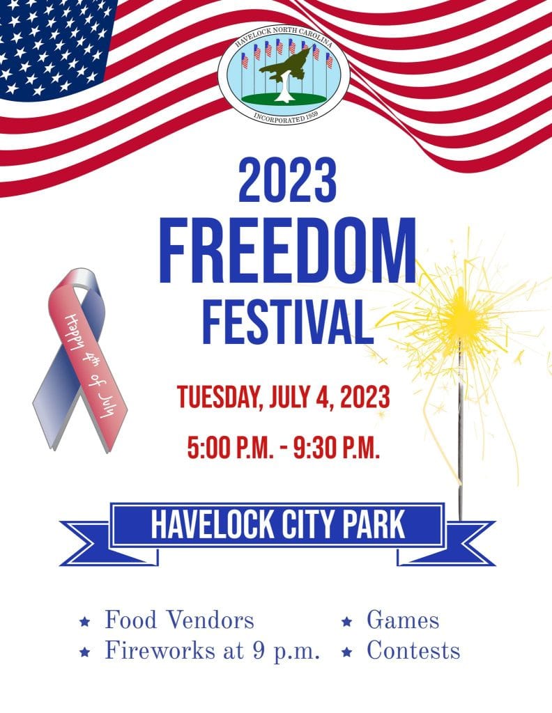 Please join the City of Havelock at the Havelock City Park for our favorite event of the year, the Havelock Freedom Festival. The event will feature the 2nd MAW Band, food vendors, games, contests, and our famous fireworks display at 9 p.m. Be sure to get here early to get a parking space!