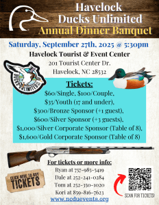 Read MoreBuy Tickets The Havelock Tourist & Event Center is proud to host the Ducks Unlimited Havelock Banquet on Saturday, September 27, 2025. Doors open at 5:30 PM, and guests are invited to enjoy an evening of dining, fellowship, and fundraising in support of wildlife and wetland conservation. This annual banquet is more than just a dinner-it’s a chance to be part of Ducks Unlimited’s mission to conserve, restore, and manage wetlands and associated habitats for North America’s waterfowl. Guests will enjoy a delicious meal and beverages while taking part in raffles, silent and live auctions, and exciting games offering exclusive merchandise, outdoor gear, and firearms. A variety of ticket options are available to suit individuals, families, and businesses, from single and couple tickets to sponsorship levels that include reserved seating, raffle opportunities, and special gifts. Sponsorships also provide a unique way to support conservation while receiving tax-deductible benefits. Event Location: Havelock Tourist & Event Center, 201 Tourist Center Drive, Havelock, NCDate & Time: Saturday, September 27, 2025 – Doors open at 5:30 PM Whether you’re […]