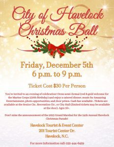 The City of Havelock invites the community to celebrate the holiday season at the annual Christmas Ball on Friday, December 5th, from 6 p.m. to 9 p.m. at the Havelock Tourist & Event Center. This festive evening promises an unforgettable experience with a catered dinner, live music by Amazying Entertainment, photo opportunities to capture the memories, and exciting door prizes throughout the night. A cash bar will be available for guests 21 and over. This year’s event holds special significance as attendees are encouraged to wear semi-formal attire in red and gold to honor the Marine Corps’ 250th Birthday-a fitting tribute to Havelock’s strong military community and heritage. The evening will also feature a special announcement revealing the 2025 Grand Marshal for the 54th Annual Havelock Christmas Parade, adding an extra element of excitement to the celebration. Tickets are $30 per person and available for purchase at the Senior Center, Recreation Center, and City Hall. Limited tickets may be available at the door. The event is open to ages 16 and up. Don’t miss this […]
