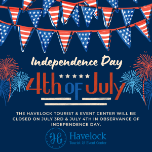 Read MoreThe Havelock Tourist & Event Center will be closed on Monday, July 3rd and Tuesday, July 4th in honor of America’s Independence.