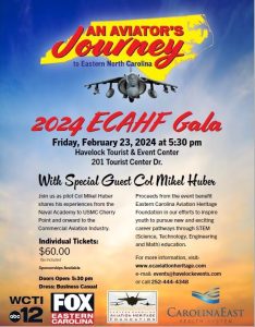 Please join us as pilot Col Mikel Huber shares his experiences from the Naval Academy to USMC Cherry Point and onward to the Commercial Aviation Industry. For more information, visit: www.ecaviationheritage.com, email: events@havelockevents.com or call 252-444-4348